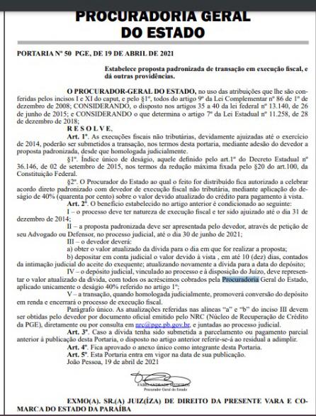 PGE-PB baixa portaria que concede desconto de 40% em dívidas fiscais não tributárias com o Estado